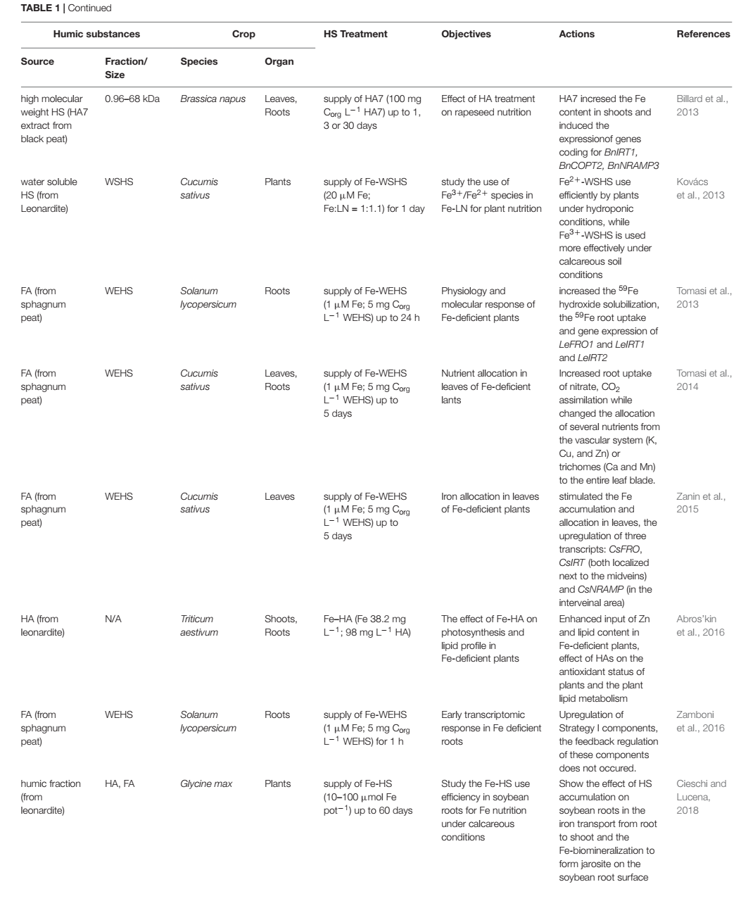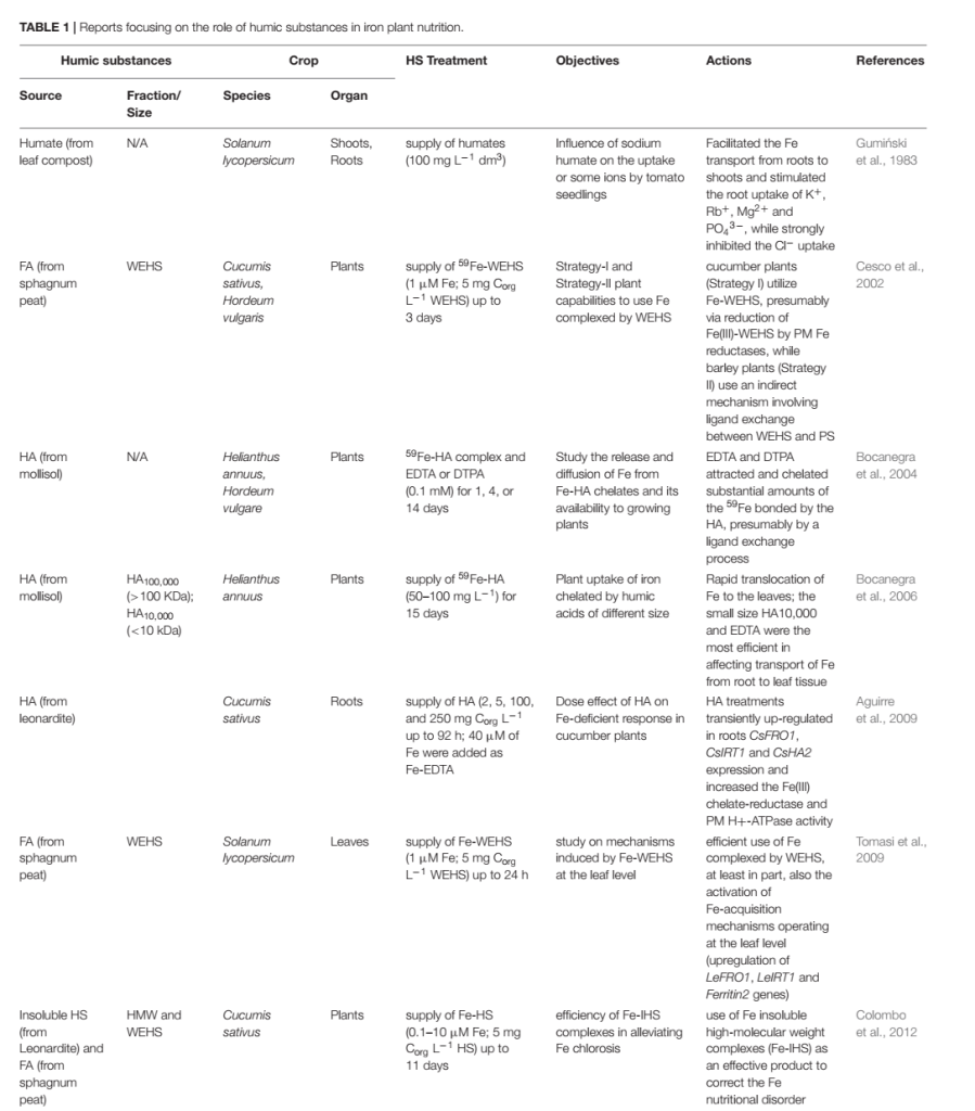 งานวิจัยจำนวนมากพบว่าสารอาหารธาตุเหล็กพืชที่นำไปใช้ได้เพิ่มขึ้น จากการก่อรูปเป็นโครงสร้างเชิงซ้อนของธาตุโลหะต่าง ๆ ที่จับคู่กับสารฮิวมิค อันมีที่มาจากแหล่งต่างกัน โดยทั่วไป อินทรีย์วัตถุจะแปรสภาพเป็นฮิวมิคในดินตะกอนและสารละลาย และมีบทบาทในการเพิ่มการสะสมธาตุเหล็ก (Fe) ในดินและพืช โดยปริมาณการสะสมนี้ ขึ้นอยู่กับประสิทธิภาพการละลายน้ำและขนาดโมเลกุลของฮิวมิค ซึ่งจะคายลิแกนด์โลหะ (metal ligand) ออกมา ทั้งนี้ฮิวมิคยังเอื้อให้โครงสร้างเชิงซ้อนระหว่างธาตุเหล็ก (Fe) และฮิวมิค อยู่ในสภาพที่พร้อมใช้งานสำหรับกระบวนการดูดซึมธาตุเหล็กของพืช งานวิจัยยังพบด้วยว่าฮิวมิคจะเพิ่มศักยภาพทางกายภาพของกระบวนการดูดซึมแร่ธาตุที่เกี่ยวข้อง โดยธาตุเหล็ก (Fe) จะมีบทบาททั้งในช่วง Transcriptional และ Post-Transcriptional ของการสังเคราะห์ RNA พืช อย่างไรก็ตามการกระจายและการเคลื่อนย้ายธาตุเหล็ก (Fe) ในส่วนต่าง ๆ ของพืช ยังอาจถูกดัดแปลงได้ หากพืชได้รับคีเลต (โครงสร้างเชิงซ้อน) ธาตุเหล็ก-ฮิวมิค ที่ละลายน้ำได้ และมีโครงสร้างแบบเดียวกันกับคีเลตของธาตุอื่น ๆ (ทั้งสังเคราะห์หรือเกิดตามธรรมชาติ) ผลการวิจัยนี้ ตรงกับที่เคยสังเกตในงานวิจัยก่อน ๆ ซึ่งระบุว่า การเติมฮิวมิคเข้าไป สามารถดัดแปลงโครงสร้างรากพืชและยังกำหนดกิจกรรมในชั้นเนื้อเยื่อเซลล์พืช (plant membrane) ที่เกี่ยวข้องกับเส้นทางการลำเลียงสารอาหารของระบบการเผาผลาญพลังงานชั้นเอก (Primary) และชั้นรอง (Secondary) และส่งผลต่อสมดุลฮอร์โมน กับสมดุลปฏิกิริยาออกซิเจน บทบาทของฮิวมิคที่หลากหลายบ่งชี้ว่า โครงสร้างเชิงซ้อนของฮิวมิคและธาตุเหล็ก (Fe) ที่ละลายน้ำได้ สนับสนุนกระบวนการดูดซึมของพืชในแบบที่ซับซ้อน โดยการจัดหาธาตุเหล็กในรูปแบบที่พร้อมใช้งานในไรโซเสฟียร (rhizosphere) และโดยการกระทบต่อโครงสร้างทางกายภาพพืชโดยตรง นอกจากนี้ อาจสามารถพิจารณาได้ว่า การมีธาตุเหล็ก (Fe) และฮิวมิคที่สามารถละลายน้ำได้ จากหลาย ๆ แหล่ง หลาย ๆ ขนาดโมเลกุล ในรูปแบบสารละลายที่ต่างกัน เพื่อใช้เป็นปุ๋ยธาตุเหล็ก (Fe) ถือเป็นการอนุรักษ์สิ่งแวดล้อมในการเกษตรแบบหนึ่ง