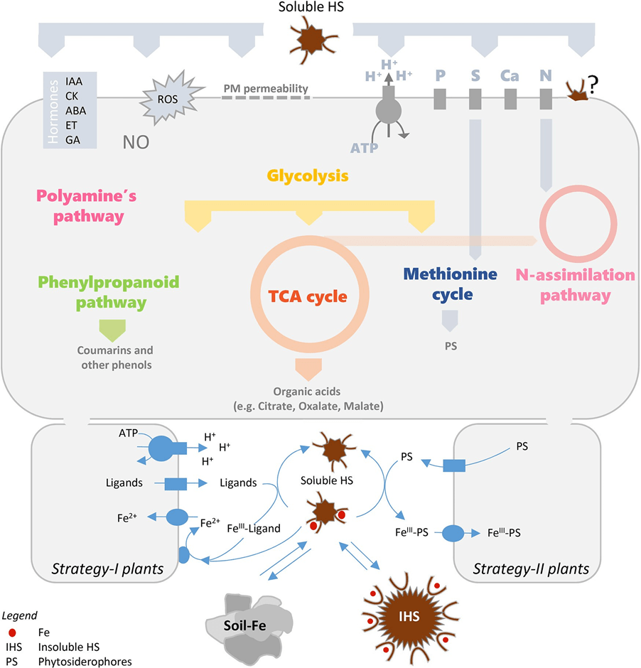 ผลของฮิวมิคต่อการเจริญของราก (เส้นทางส่งสัญญาณ; signaling pathways) ต่อการดูดซึมไอออน (primary and secondary membrane transporters) ระบบเผาผลาญพลังงานหลัก (ไนโตรเจนและคาร์บอน), ระบบเผาผลาญพลังงานรอง (เฟนนิลโพรพานอยด์) และสารหลั่งจากรากพืช มีความสำคัญต่อการดูดซึมธาตุเหล็ก (Fe) และพัฒนาการตอบสนองของพืชต่อสภาวะการขาดธาตุเหล็ก (Fe) (Figure 1)