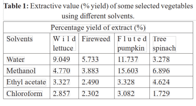 Table 1 แสดงค่าเปอร์เซ็นต์สารสกัด จากตัวทำละลายต่าง ๆ ของวัตถุดิบผักที่นำมาใช้ในการทดลอง ผักที่ใช้ในการทดลองนี้ได้แก่ ผักกาดป่า (Wild Lettuce) ผักไฟร์วีด (Fireweed) ฟักทองร่องยักษ์ (Fluted Pumpkin) และคะน้าเม็กซิโก (Tree Spinach) โดยตัวทำละลายที่ใช้ ได้แก่ น้ำ (Water) เมทานอล (methanol) เอทิลอะซิเตต (Ethyl Acetate) และคลอโรฟอร์ม (Chloroform)