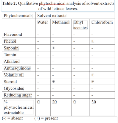 ตารางที่ 2 แสดงการวิเคราะห์เชิงคุณภาพของสารสกัด Phytochemical ที่ได้จากการผักกาดป่า ใช้ตัวทําละลายต่าง ๆ โดยตัวทําละลายที่ ใช้ ในการสกัดได้ แก่ น้ำ เมทานอล เอทิลอะซิเตท และคลอโรฟอร์ม เพื่อหาสารฟลาโวนอยด์ ฟีนอล ซาโปนิน แทนนิน อัลคาลอยด์ แอนทราควิโนน น้ำมันระเหย สเตียรอยด์ ไกลโคไซด์ และน้ำตาลรีดิวซ์ ซึ่งการทดลองไม่พบสารประกอบ Phytochemicals ในสารสกัดของพืชที่ทำละลายในตัวทำละลาย น้ำ และเอทิลอะซิเตต และพบสารซาโปนินกับสเตียร์ลอยในสารสกัดของผักกาดป่า ที่ทำละลายในตัวทำละลายเมทานอล ในตัวทะละลายคลอโรฟอร์ม พบฟีนอล น้ำมันหอมละเหย และสตียร์ลอย โดยเปอร์เซ็นต์ของสารสกัด Phytochemicals ที่ได้จากการใช้ตัวทำละลายเมทานอล และคลอโรฟอร์ม คือ 20% และ 30% ตามลำดับ