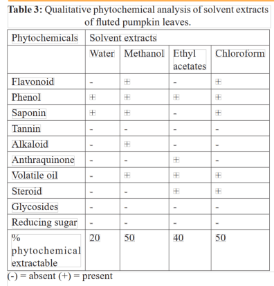 ตารางที่ 3 แสดงค่าการวิเคราะห์ Phytochemical ที่ได้จากการสกัดใบฟักทองร่องยักษ์ ในตัวทำละลายต่าง ๆ ในบรรดาสารประกอบ Phytochemicals ทั้ง 10 ตัว พบเพียง ฟีนอล ซาโปนิน ในตัวทำละลายน้ำ พบสาร ฟลาโวนอยด์ ฟีนอล และซาโปนิน อัลคาลอยด์ และน้ำมันหอมละเหย ในตัวทำละลายเมทานอล และพบ ฟีนอล แอนทราควิโนน น้ำมันหอมละเหย และสเตียร์ลอยด์ ในตัวทำละลายเอทิลอะซิเตต ขณะที่นักวิจัยพบ ฟลาโวนอยด์ ฟีนอล และซาโปนิน น้ำมันหอมละเหย ในตัวทำละลายคลอโรฟอร์ม เปอร์เซ็นต์ของสาร Phytochemicals ที่ได้จากตัวทำละลาย น้ำ เมทานอล เอทิล อะซิเตต และคลอโรฟอร์ม ของใบฟักทองร่องยักษ์ คือ 20% 50% 40% และ 50% ตามลำดับ งานวิจัยพบว่าใบฟักทองร่องยักษ์มีสารสกัด Phytochemicals ที่ได้จากตัวทำละลายทั้ง 4 ตัว มากกว่าใบผักกาดป่า และยังพบว่า สารประกอบฟีนอล จากใบฟักทองร่องยักษ์ สามารถพบได้ในสารสกัดด้วยตัวทำละลายทุกตัว และพบสารประกอบซาโปนิน ได้ในตัวทำละลายทุกตัว ยกเว้น เอทิล อะซิเตต และสามารถพบน้ำมันหอมละเหยได้ในตัวทำละลายทุกตัว ยกเว้น น้ำ